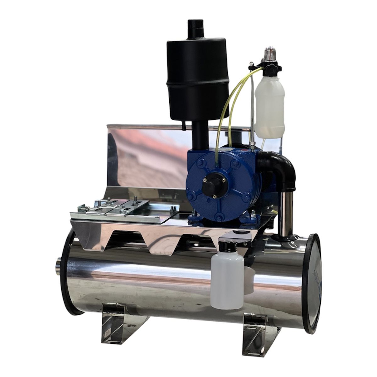 Indicado para salas de ordenha que exigem maior reserva de vácuo, o conjunto com reservatório em inox contribui para melhor estabilidade operacional, menor variação de vácuo e maior confiabilidade durante a ordenha. A ausência do motor facilita a adaptação a diferentes projetos e reposições em campo.